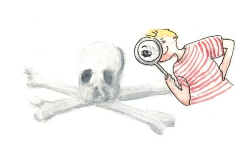 Mit der Lupe kannst du dir den Totenkopf und die Inschrift ganz genau anschauen.