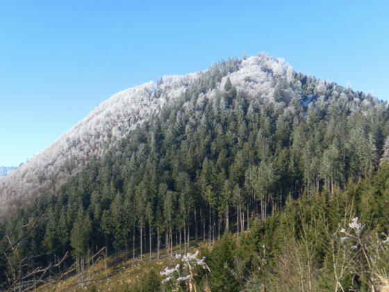 Zurück zum Sattel. Von hier zieht sich ein Hohlweg durch die Westflanke des Filblings. Ein Wanderpfad zweigt bald rechts in den Hochwald ab. Dieser quert am Rand einer Schneise hinauf zum Nordwestgrat des Filblings. Auf einem breiten Wurzelweg geht es direkt am Gratrücken in mehreren Stufen hinauf zum Gipfelkreuz mit Buch und Rastbank hinauf. Am flachen Gipfelkamm wandern wir zum relativ steilen Südostgrat. Am wurzelig-schrofigen Waldpfad geht es zum Ostsattel hinab. Hier kann als lohnende Draufgabe nordwärts auf einem Hohlweg 80HM zum idyllischen Filblingsee abgestiegen werden. Ansonsten folgen wir dem Karrenweg südwärts hinunter zur Sattelalm, wobei zuletzt auf einem Pfad links im Wald abgekürzt wird. Wir folgen nun über Wiesen dem Almweg in den Schmiedhorngraben hinein. Bei der beschilderten Abzweigung bleiben wir am Hohlweg, der nun steil die bewaldeten Westhänge hinunterführt. Bei der nächsten Verzweigung (beide "Feistenau") wählen wir den linken Ast, der weiterhin steil zur Tiefenbrunnauerstraße leitet. Auf der Teerstraße links knapp 800m zurück zum Steinbräu. Alternativ kann (verkehrslos) 100 Meter vor der Hauptstraße der nach links abzweigende Karrenweg gewählt werden, der zuerst bergauf und dann recht verwachsen und etwas steinschlaggefährdet zum Ausgangspunkt hinabführt.