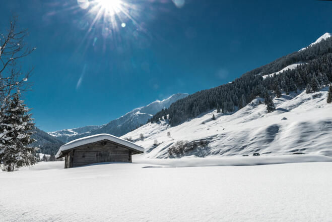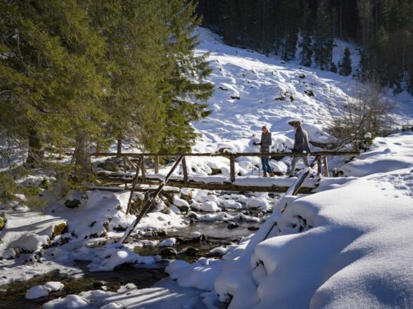 Gehen Sie mit den Schneeschuhen entlang des Winterwanderweges. Es geht immer Richtung Süden, entlang der Ache, die knappe 700 Höhenmeter weiter oben entspringt, an tiefverschneiten Wiesen vorbei bis ans Talende, wo der Winterwanderweg an einer Brücke endet.