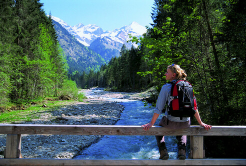 die Trettach, die Mädelegabel und den Bockarkopf. Der Hochleite den Rücken gekehrt, dem Weg stetig bergab durch Mischwälder, Lichtungen und saftig grüne Wiesen nach Schwand folgen.