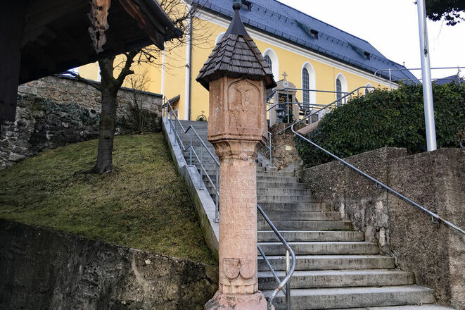 Die rote Marmorsäule wurde 1518 an der damaligen Straße von Bernau nach Weisham errichtet. Die Säule ist 2,70 m hoch und hat auf ihrer Vorderseite folgende Inschrift: