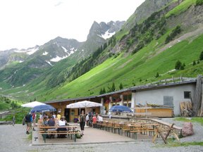 Weiter zunächst auf dem linken Bachufer und später auf der rechten Seite über Weideböden, zuletzt in steilen Kehren, zur der nach dem Jagdliebhaber Sir Frederik Simms benannten und von ihm verbauten Hütte auf 2.002 m. Die Hütte ist von Ende Juni bis Ende September bewirtschaftet.