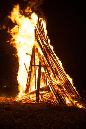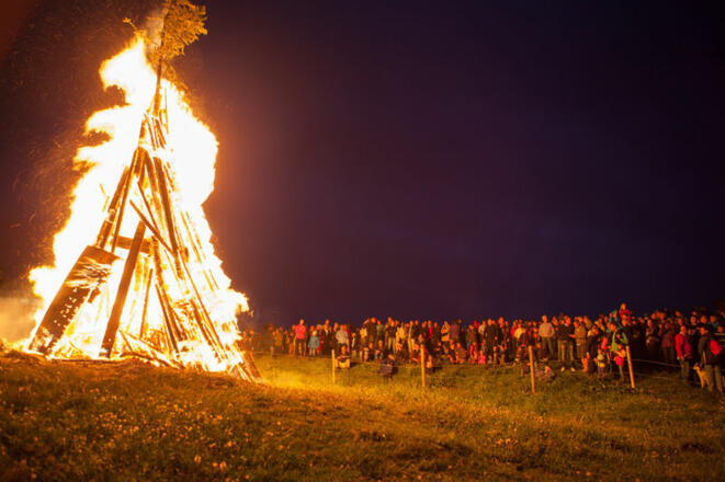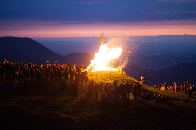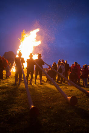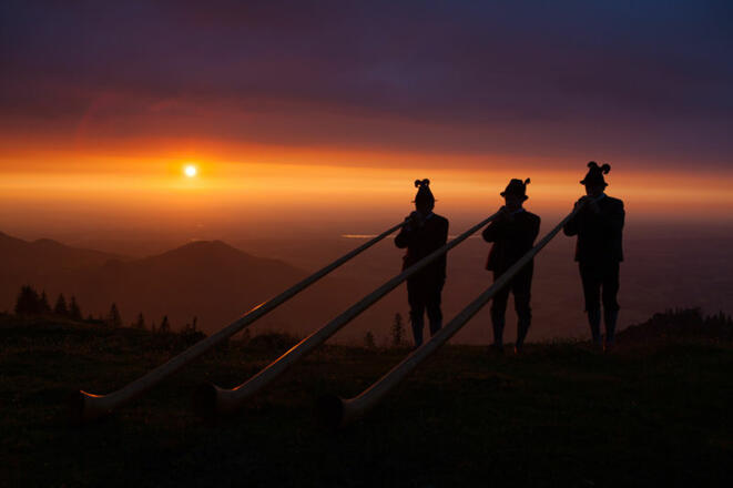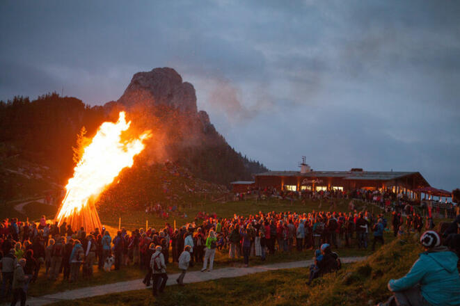 Nach Einbruch der Dunkelheit, musikalisch umrahmt von Alphornbläsern, wird ein großes Sonnwendfeuer entfacht. Der Blick aufs Feuer und ins Tal Richtung Chiemsee ist dabei einmalig!