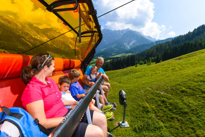 Von der Talstation der Hochmaisbahn wandern wir den neuen Wanderweg über Wiesen bis zur Hochmaisalm, zurück nehmen wir den gleichen Weg.