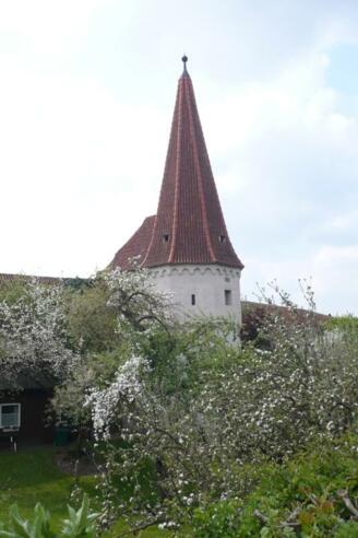Im Jahre 1481 wird er erstmals als "Newetürmlein" erwähnt - 1592 erfolgte eine Instandsetzung. Ein Zwischenbau mit einem Satteldach verbindet den Spitzturm mit dem Wehrgang der Stadtmauer.