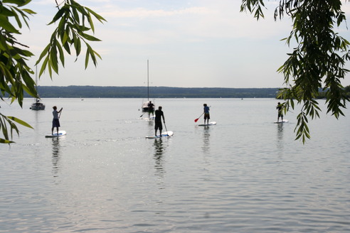 Das Stand Up Paddeln erfreut sich immer größerer Beliebtheit. Im Strandbad Chieming können Sie sich verschiedene Stand Up Paddelbretter ausleihen.