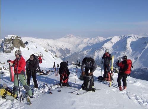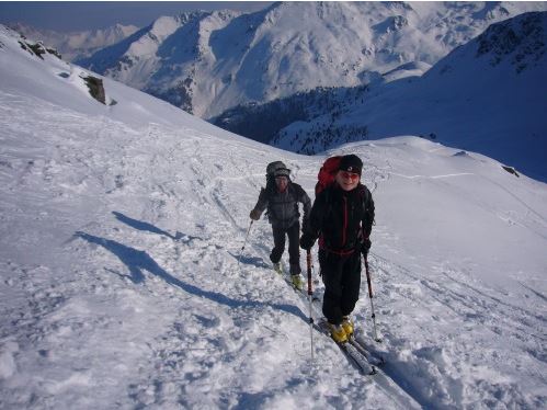 Schitouren- und Notfallausrüstung (LVS, Schaufel, Sonde, Biwak, Erste Hilfe), eventuell Harscheisen