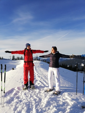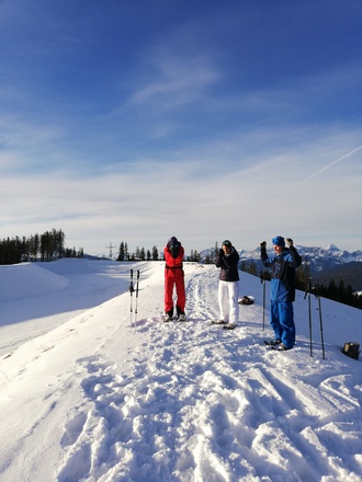 Schneeschuhe, Stöcke, gutes, rutschfestes Schuhwerk