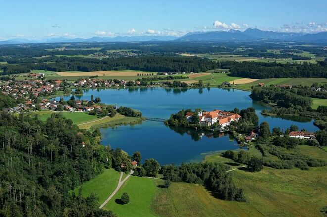 Ein naturnaher See mit Blick auf das Kloster Seeon.