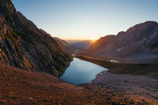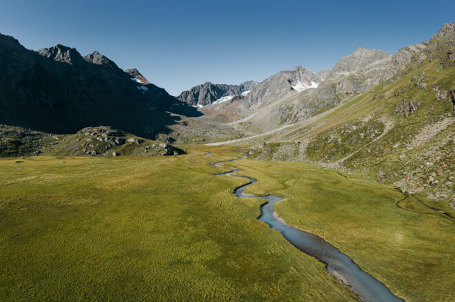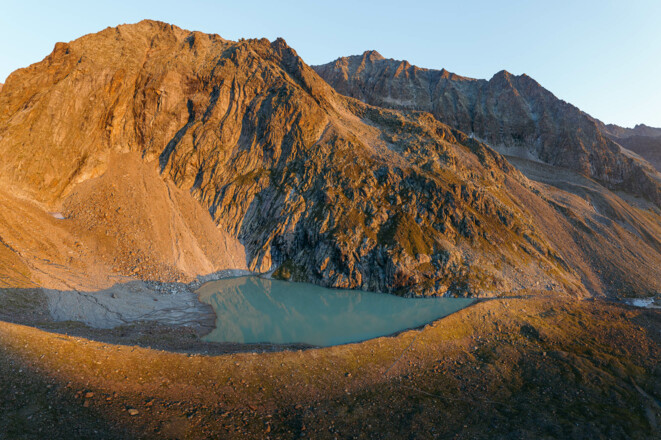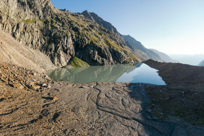 Dieser Moränensee liegt, versteckt hinter der Seitenmoräne des Hochmoosferners, auf 2.575 Metern Höhe und wird wohl nur Gebietskennern bekannt sein. Das Schmelzwasser des Gletschers, das zunächst den See speist, durchfließt im Anschluss das Hohe Moos. Deutlich kann man hier noch das trübe Gletscherwasser ausmachen, das in Mäandern die Moorfläche durchfließt. Das Becken, in dem das Überflutungsmoor liegt, ist wesentlich älter als der See. Es wurde bereits nach der letzten Eiszeit von den Gletschern freigegeben. Dort bildete sich zunächst ein See, der über die Jahrtausende verlandete und sich zu einem Moor umbildete. Heute sind dort nur noch wenige Torfreste vorhanden. Im Frühsommer sind die Feuchtflächen dicht mit weißem Wollgras bewachsen und besonders sehenswert. Die Spuren der Gletscher, mit Moränenwällen und glattgeschliffenen Gesteinsplatten, prägen den Hochgebirgslebensraum auf Schritt und Tritt.