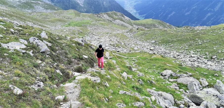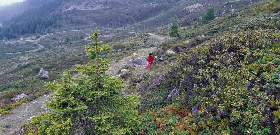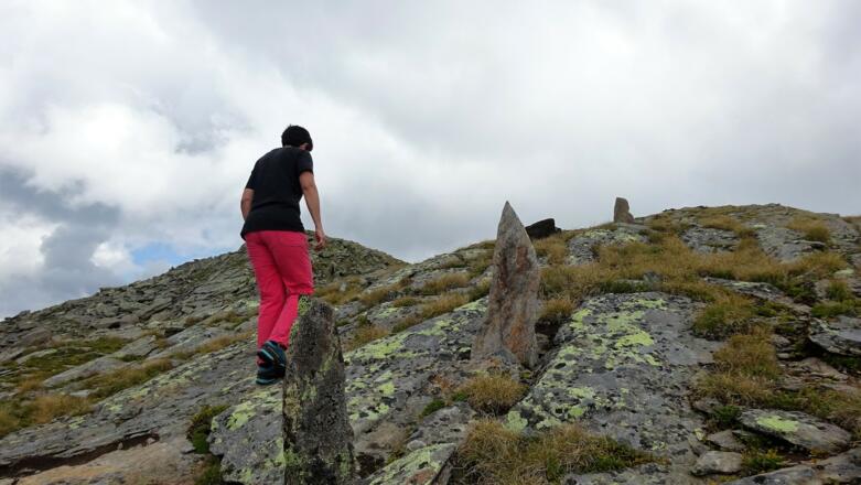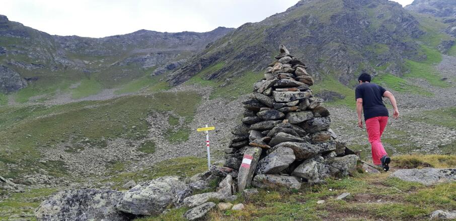 Bei einem Wegweiser, dem letzten Kreuzungspunkt auf unserer Tour, biegen wir links ab. Über wunderschöne Flächen mit Alpenrosen gelangt man erst in die Senke am Roßboden und später zum großen, gut sichtbaren Steinmann am Grüngarten. Jetzt leiten die Markierungen nach links über den Boden, wo der Weg dann wieder ansteigend zu einer Jägerhütte führt. Der große Steinmann unterhalb der Hütte, ist schon von Weitem zu sehen.