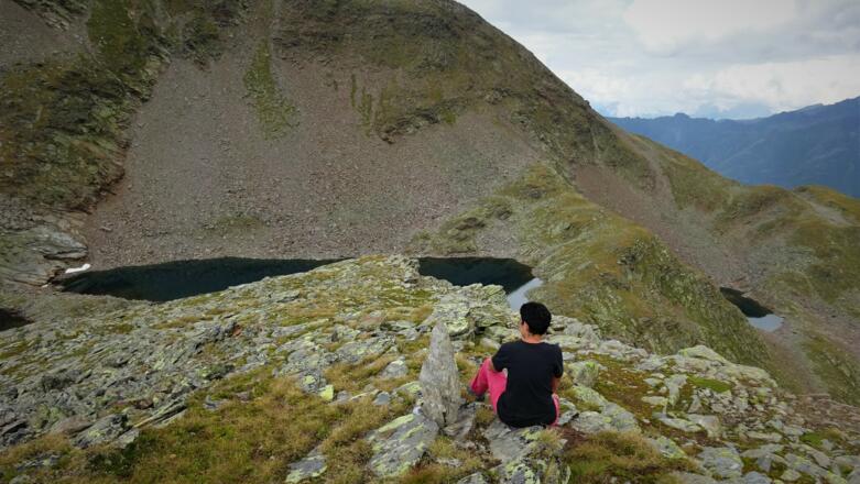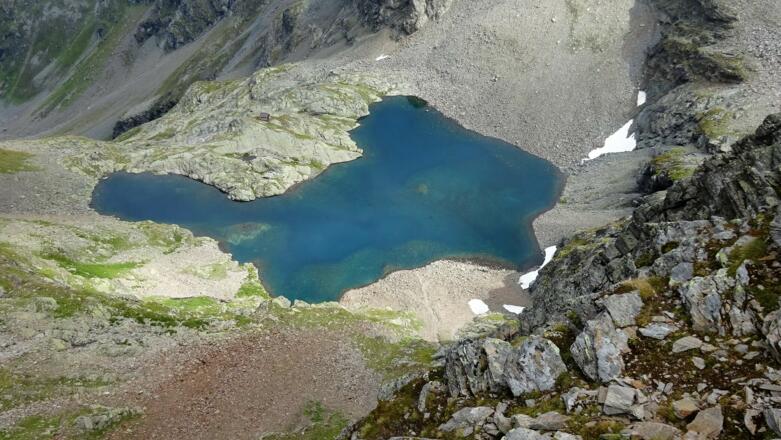 Vom Gipfel aus hat man einen Blick auf den Kugleten, sowie den weiter unterhalb liegenden, betörend schönen Krummensee, das Pitztal und den dahinter liegenden Geigenkamm.