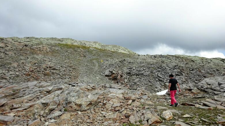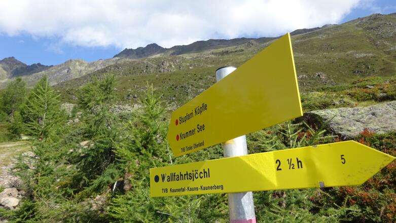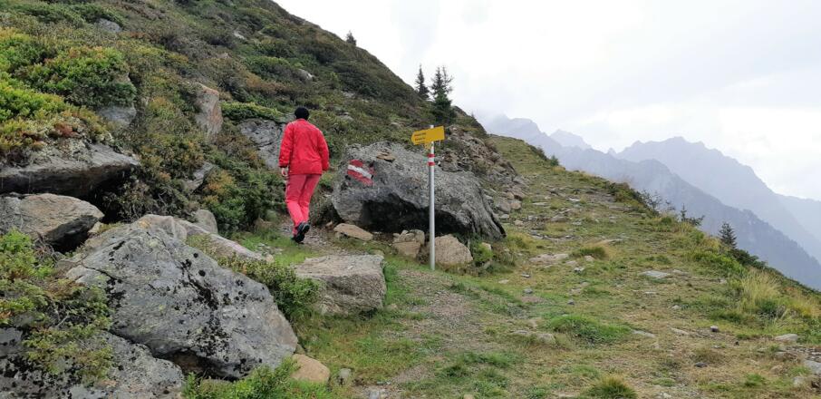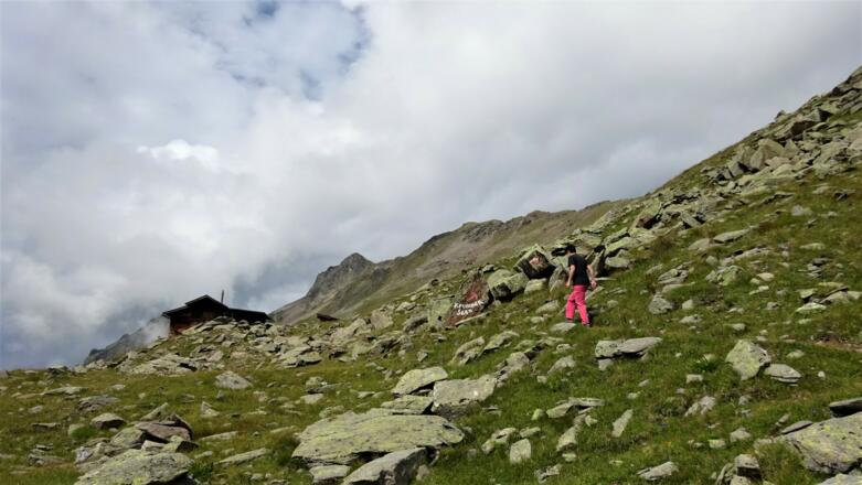 Wenige Schritte vor der Hütte biegt der Steig unverkennbar (große Inschrift auf einem Felsen) nach rechts ab. Die Umgebung verändert sich bald in eine karge, mit Schieferplatten bedeckte Landschaft, durch die der Steig auf den breiten Gratrücken nördlich des Falkaunsjochs hinauf führt (Wegweiser). Aufgestellte Steintafeln leiten auf den höchsten Punkt des Stupfarri Köpfle (2.808 m).