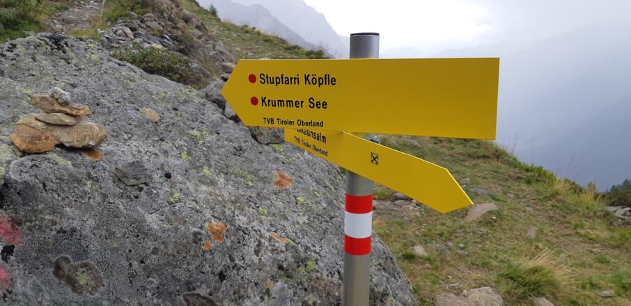 Ein stolzer, markanter Berggipfel ist das Stupfarri Köpfle nicht. In wenigen Minuten erreicht man vom Falkaunsjoch den höchsten Punkt des so bezeichneten Steinhügels. Dafür ist diese Tour in dem sonst schroffen und extremen Kaunergrat einfach und sicher, d.h. der Weg weist keine Passagen mit Absturzgefahr auf. Was diesem "Gipfel" an Würde fehlt, das entschädigt er mit dem Ausblick auf die Riesen im Kaunergrat, vor allem aber mit seinen Seen - dem Kugleter See und dem tiefer gelegenen, faszinierend schönen Krummer See.