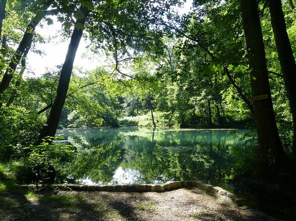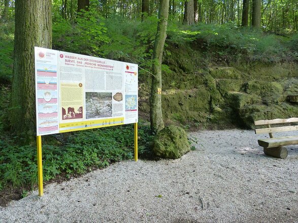 Der Suevitsteinbruch wird vor Ort durch eine Informationstafel erläutert.