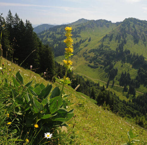 Beim Abstieg vom Leiterberg zur Scheidwang-Alpe führt der Weg durch eine parkartig anmutende Landschaft im hügeligen Nagelfluhgelände. Besonders sehenswert sind die alten Bergahorne, Buchen, Weißtannen und Fichten, die den Weg säumen.