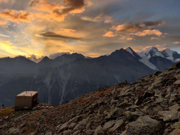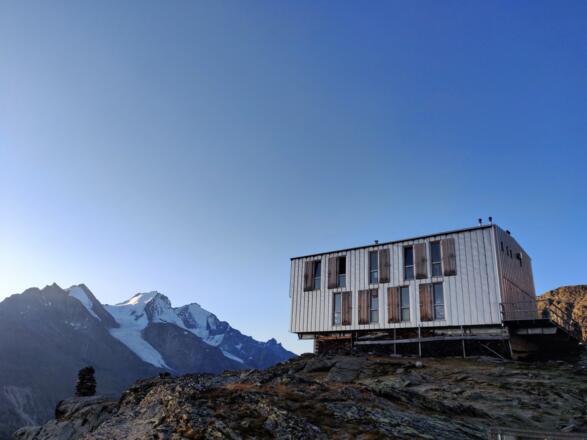 Berghütte des Schweizerischen Alpenclubs auf 2674m ü. M. mit Panoramablick auf die Mischabelgruppe.