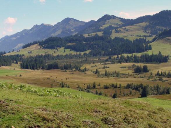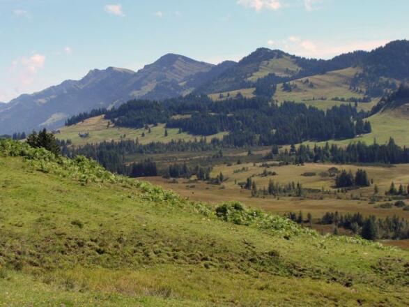 Die Rundwanderung zum Kojen vereint vieles von dem, was den Naturpark so wertvoll macht. Sie beginnt in dem kleinen, traditionell geprägten Ort Riefensberg und führt zunächst bergauf durch einen naturnahen Bergmischwald. Das Steinerne Tor markiert den Übergang auf die Hochfläche des Häderichmoores. Zunächst führt der Weg am Grat entlang zum Kojenstein, der mit 1.300 m Höhe einen guten Überblick über die Landschaft des Vorderwalds und der Nagelfluhketten gibt. Von dort steigt man wieder knapp 100 Höhenmeter zur Hochfläche ab und quert am Hangfuß zum Alpstüble Moos. Hier schließt sich eine eindrucksvolle Rundstrecke durch das Häderichmoor an. Über das Steinerne Tor geht es zurück nach Riefensberg.
