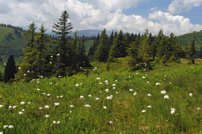 Besonders reizvoll sind die Moorgebiete auf dieser Tour. Immer wieder wandert man an kleinen Moortümpeln vorbei, an denen sich im Sommer zahlreiche, zum Teil seltene Libellen beobachten lassen. Auch Grasfrösche fühlen sich in den hochgelegenen Tümpeln wohl und pflanzen sich im Frühjahr erfolgreich fort. In den feuchteren Bereichen der Moore wächst das sternförmige Torfmoos, an den trockeneren Stellen gedeihen Rausch- und Heidelbeere. An vielen Stellen wiegen sich auch die weißen Blütenköpfchen des Wollgrases im Wind.