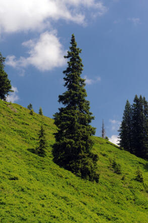 Bereits beim Abstieg vom Weiherkopf wandert man durch den ersten sehenswerten Bergwald. Aufmerksamen Beobachtern fällt sofort der Reichtum an Farnen, Moosen und Flechten ins Auge, der stark an nordische Wälder erinnert. Auffällig sind auch der schlanke Wuchs und die herabhängenden Seitentriebe dieser sogenannten Kammfichten. Dadurch wird die Auflagefläche für Schneelasten gering gehalten – eine geniale Anpassung an die Lebensbedingungen im schneereichen Hochgebirge.