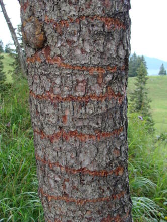 Mit etwas Glück entdeckt man einzelne Bäume mit seltsamen, waagrechten Ringen in der Rinde. Hier war der seltene Dreizehenspecht am Werk. Er ringelt mit seinem harten Schnabel die Fichten, um an den im Frühjahr und Sommer aufsteigenden Saft der Bäume zu gelangen.