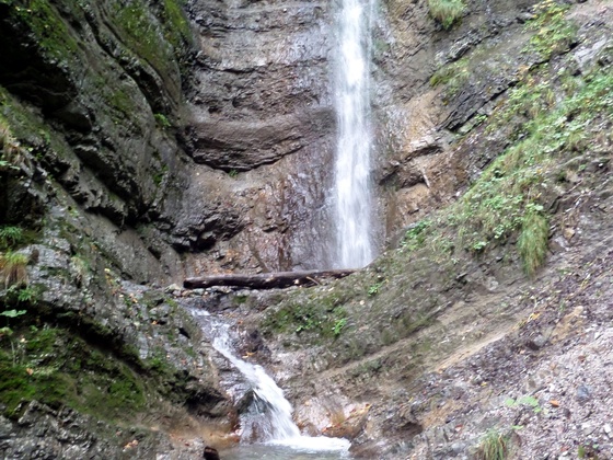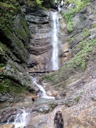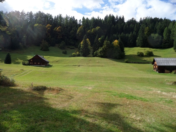Wir sind schließlich in Außerberg angekommen und befinden uns auf einer asphaltierten Straße. Wenn wir einige Meter nach links gehen, kommen wir zum äußersten Außerberg. Ein künstlich angelegter See und die Häuser sind sehenswert. Von dort wieder zurück, bzw. gleich nach rechts kommen wir zu einem sehr schönen Bauernhaus der Familie Moser, mit Blumenschmuck und Glaskunst von der Tochter des Hauses. Von dort vorbei ein kleiner Abstecher zu einem Wasserfall, der von dem herabstürzenden Plattenbach gebildet wird. Von dort wieder zurück zu dem Bauernhaus steil bergauf den "Fürkeleweg", der uns über den "Mottawaldweg" wieder zu den Steinkreisen auf die Tschengla führt.