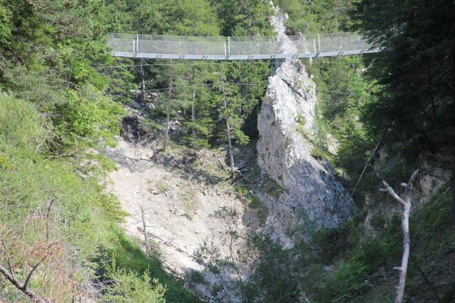 Von der Brunnsteinhütte steigt man zunächst in Serpentinen auf Weg Nr. 290 nach Westen bergab. Nachdem der schmale Weg ein Stück in gleicher Höhe nach Norden gequert ist, gelangt man an eine Gabelung. Hier folgt man rechts der Beschilderug zu "Leitersteig" und "Mittenwalder Hütte" und gelangt somit zu einer langen Hängebrücke, auf der man die breite Geröllreisee an der Sulzeklamm überquert.