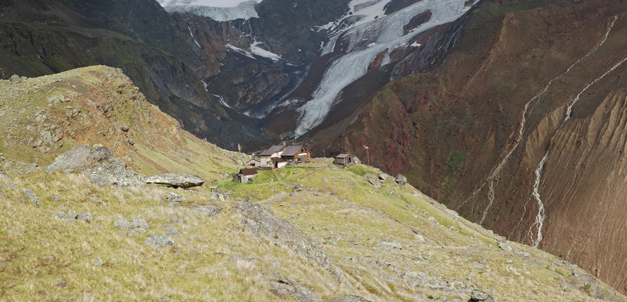 Auf der anderen Seite geht es kurz bergan, dann quert der Weg wieder flacher die weiten Südwesthänge der Schafbergalpe zur Wiesenmulde der " Inneren Schäferhütten" . Nun wieder ansteigend dann steinige Hänge nach Südosten querend stößt schließlich ein weiterer Hüttenzustieg zur Weißkugelhütte hinzu. Nun wieder nach Osten mäßig ansteigend geht es zuletzt an einem kleinen See vorbei zur herrlich gelegenen Weißkugelhütte.