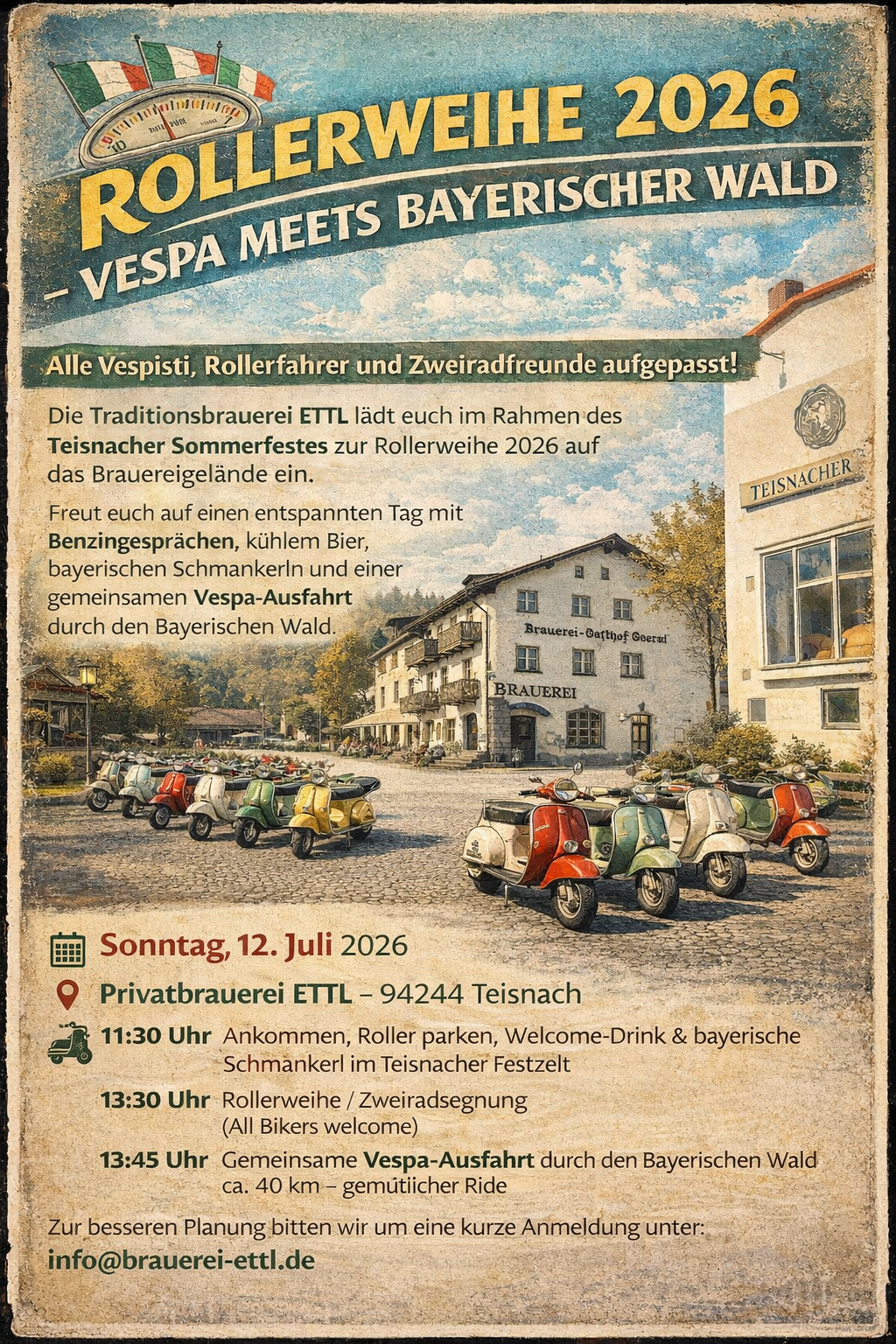 Unser Brauereidirektor ist selbst stolzer Vespa-Besitzer und war bereits bei verschiedenen Rollerweihen dabei. Die Traditionsbrauerei ETTL blickt auf 483 Jahre Brautradition zurück und steht für Werte wie Tradition, Leidenschaft und Kult – genau das, was auch eine klassische Vespa verkörpert.