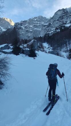Diese Skitour ist kurzweilig weil abwechslungsreich und knackig. Die steilen Felswände bieten ein herrliches Panorama. Über Forst- und Waldwege kommt man zur Baumgrenze. Hier startet super Skigelände (25-35°) bei dem man sich im Aufstieg zwischen Latschen hindurch bewegt und in der Abfahrt das Kar nimmt. Dann erreicht man das Schneekar - hier scheint so gut wie nie die Sonne also ist der Name hier Programm: Schnee und das sehr sicher sehr lange. Das Finale für starke Skifahrer bietet der Aufstieg und die Abfahrt durch eine Rinne (45°) zur Treffauer Lucke.