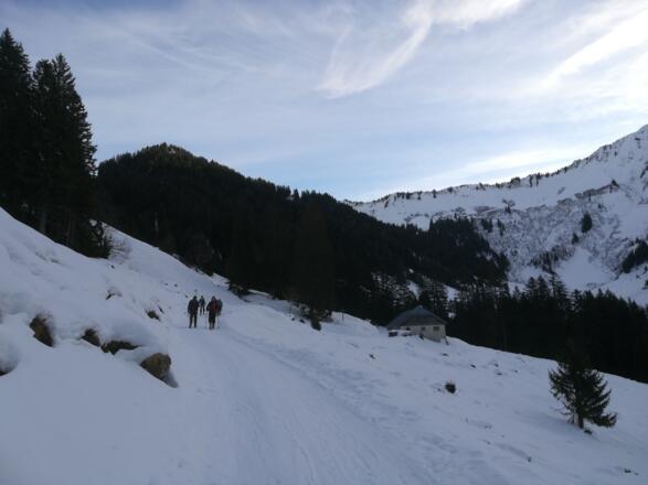 Vom großen Parkplatz in Bad Laterns (am Ende der im Winter noch befahrbaren Passtraße zum Furkajoch) geht es entlang der verschneiten Straße Richtung Furkarjoch. In einer leichte Linkskurve zweigt rechts der Weg (mit Verbotsschild gekennzeichnet) zur Aktenwaldalpe ab.
