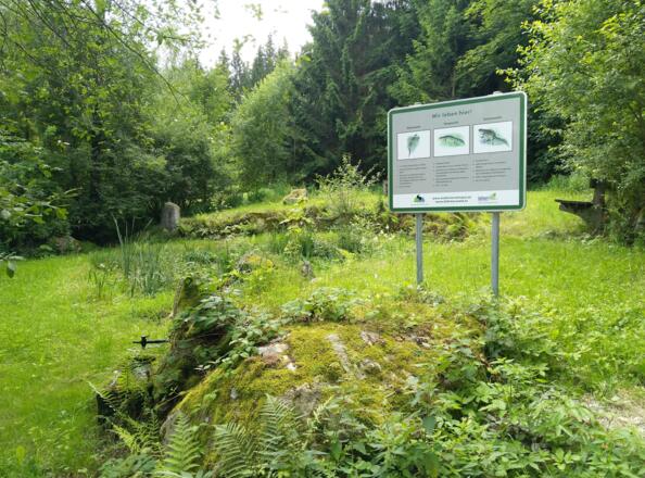 Em Ende des ersten Drittels des Weges liegt das Biotop Häuslin mit einem schön gestalteten Rastplatz mit Trinkwasserstelle. Mit etwas Glück entdeckt man im Biotop eine der drei Molcharten, die sich hier heimisch fühlen.