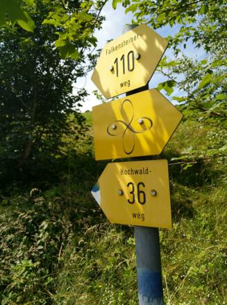Markierung: gelbe Aluschilder, zusätzlich rot-weiß-rote Baummarkierung mit Wegnummer.