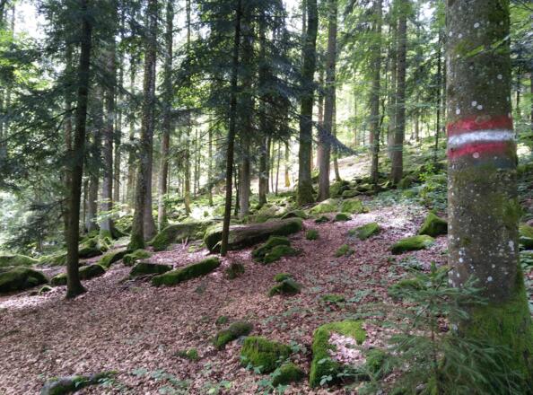 (1,1km) Biotop Häuslin. Selten gewordene Pflanzen fühlen sich hier wohl. Es erwartet Sie ein schön gestal- teter Rastplatz mit einer Trinkwasserstelle. Der Waldweg wird nun steiler. Am Waldende angelangt, steuern Sie über die Wiese dem Holzhaus zu. Hier marschieren Sie links weiter bis Sie kurz darauf am Trockenbiotop Hemmerau vorbei und gleich darauf bei einem herrlich ruhigen Rastplatz, dem