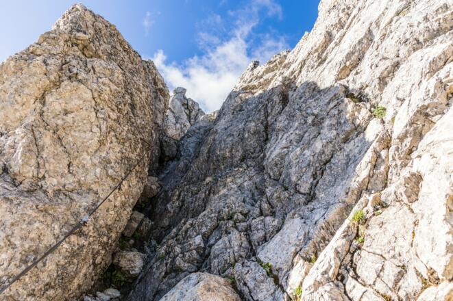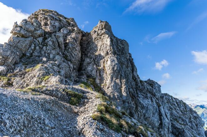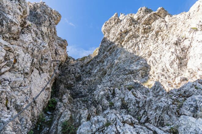 Trittsicherheit und Schwindelfreiheit notwendig. Nur bei stabilem Wetter über den Grat, da es keinen Notaustieg gibt und man sehr exponiert unterwegs ist.