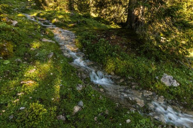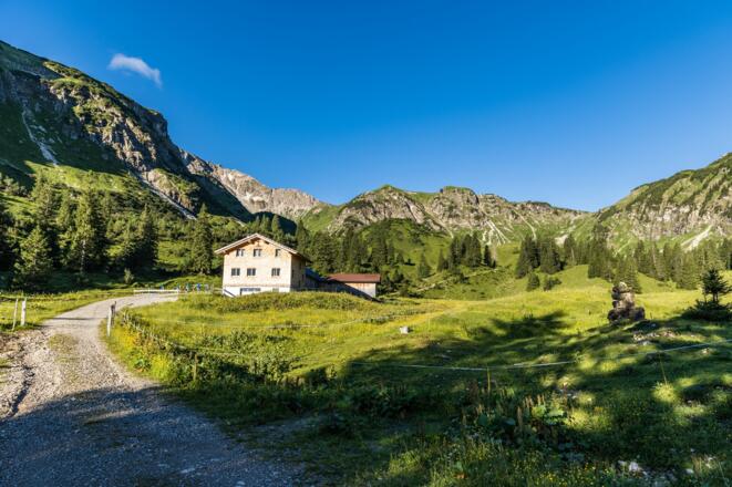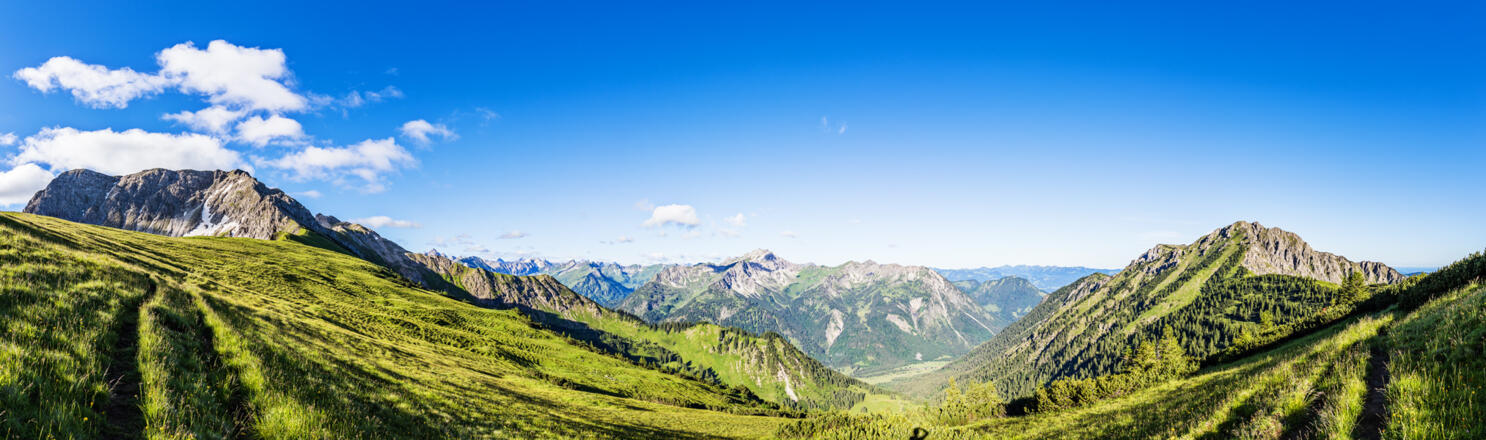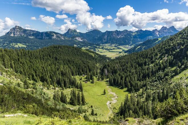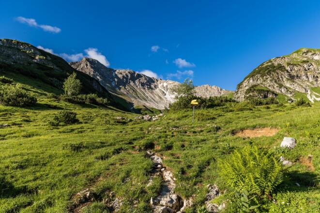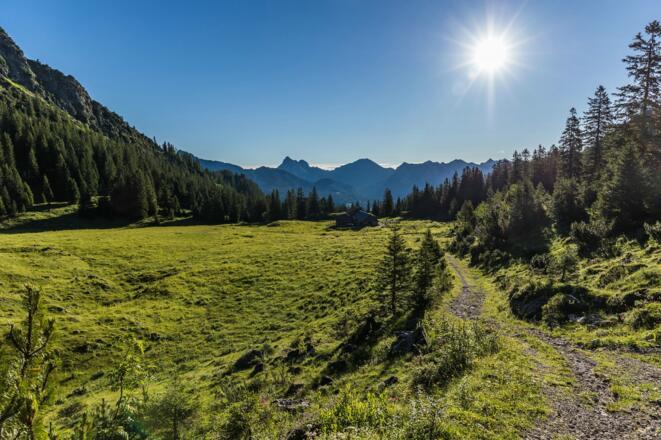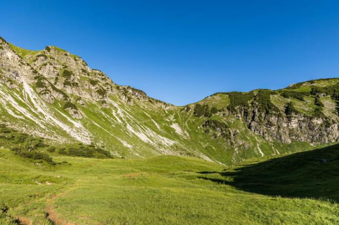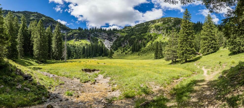 Weiter geht es über die obere Rossalpe (Grasfläche) und unterhalb des Schnurschrofen hinab ins Rossalpbachtal, vorbei an der unteren Rossalpe und wieder zurück nach Tannheim.