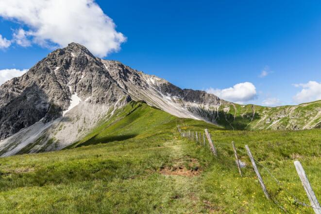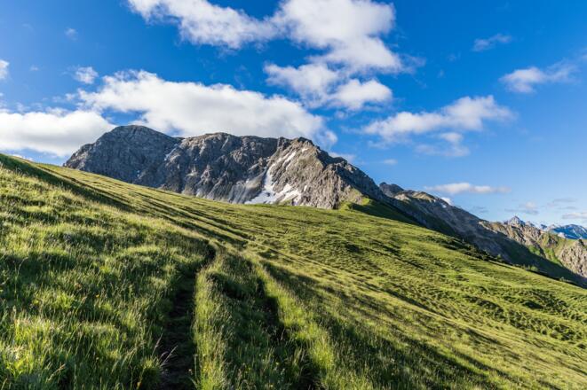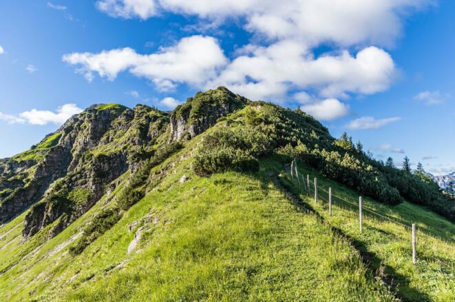 Wir wandern an der Alpe vorbei und an der nächsten Weggabelung halten wir uns rechts hinauf in Richtung Zierleseck. Im Sattel orientieren wir uns dann aber nach links und steigen den Grat hinauf zum Gaiseck. Anfangs führt der Weg durch Latschen und über Grasflächen und geht ab etwa 1950 Hm in Felsgelände über. Wir kommen an zwei kurzen, drahtseilversicherten Kletterpassagen vorbei und stehen bald auf dem Gaiseck. Von hier ist es nur noch ein Katzensprung bis zum Gaishorn.
