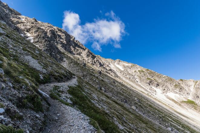 Vom Gipfel gehen wir ein kurzes Stück zurück und steigen dann über die Nordflanke hinab. Hier gibt es keine Kletterstellen, aber der Weg ist zum Teil recht bröselig, stellenweise ausgesetzt und es können sich bis weit ins Jahr hinein Altschneefelder halten.