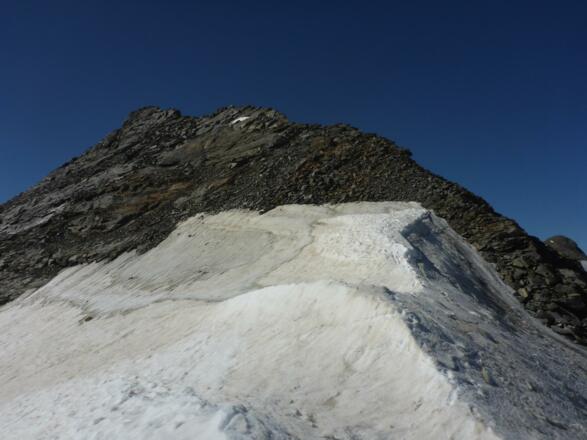 Auf dem breiten Rücken angekommen erwartet uns zunächst eine deutlich sichtbare Pfadspur Richtung Gipfel. Diese verliert sich nach kurzer Zeit im steinig, blockigen Gelände. Wir halten uns immer links oder direkt auf der höchsten Stelle des Grates. Ein Ausläufer des Gepatschferners zieht sich zwischenzeitlich über den Grat. Er kann im Normalfall leicht gequert werden. Vor dem Betreten des Eisfeldes empfiehlt es sich den Gipfel sowie den Weg bis dorthin einzuprägen. Zwischenzeitlich verschwindet er durch vor ihm liegende Erhebungen und die Orientierung ist ab hier nicht mehr eindeutig erkennbar.