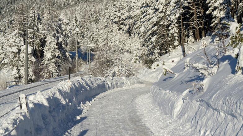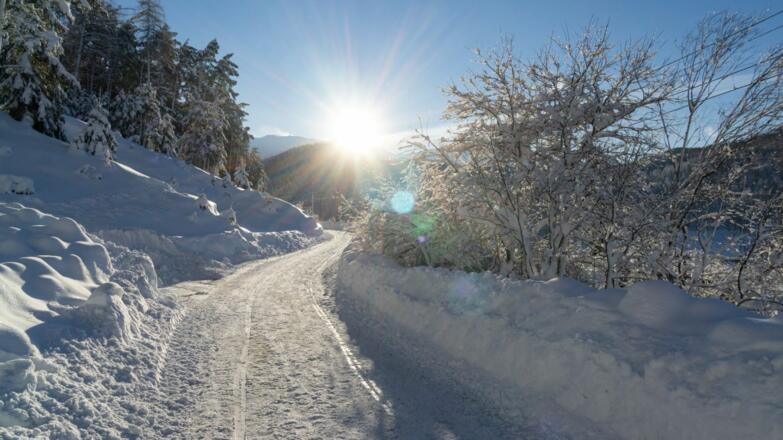 Kurz nach dem kleinen See am Lobaweg kreuzt die Wanderroute die Bundesstraße zum Gewerbegebiet auf die andere Straßenseite und folgt dann dem Reither Waldweg durch verschneite Landschaften bis zum Dorfplatz. Dort gegenüber den Lauserweg nach unten nehmen, unterwegs die Bahntrasse und Bundesstraße mittels Unterführung kreuzen und anschließend nach rechts auf dem Möslweg den Rückweg antreten.