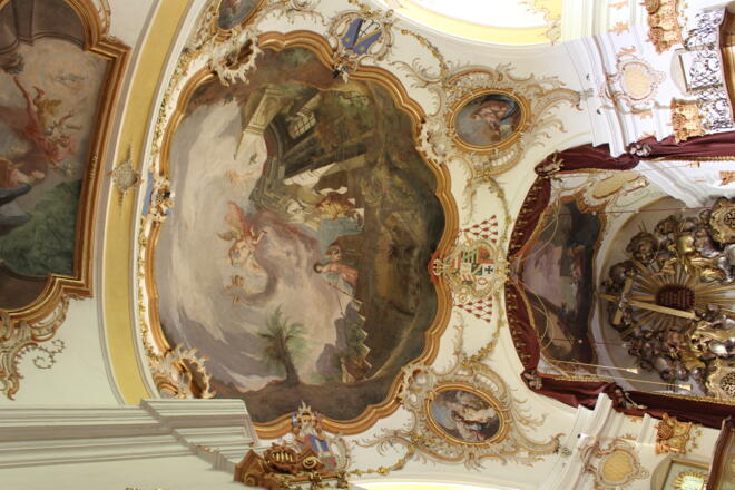 Die Deckenfresken und Altarblätter stammen von Johann Nepomuk della Croce (1771). Das Gnadenbild ist eine Salzburger Arbeit aus dem 15. Jhdt. und zeigt Maria auf einer perspektiv vertieften Thronbank sitzend. In ihrer linken Hand stützt sie fürsorglich das stehende Jesuskind, in der rechten zeigt sie eine Weintraube.