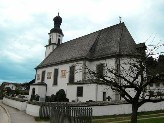 - Wir wandern weiter nach Dirnsberg mit einem sehenswerten Itakerhof und dann geradeaus weiter nach Hötzelsberg. Hier zweigt links ein Bergpfad ab, der steil zum Simssee hinunterführt (gelbe Markierung). In Antwort überqueren wir die Dorfstraße und wandern nach rechts zum kleinen Flecken Mauerkirchen hinauf. Die spitztürmige gotische Kirche wurde um 1500 vom Kloster Frauenchiemsee in Auftrag gegeben, auch der Bundwerkstadel unterhalb der Kirche ist sehenswert.