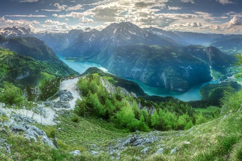 Eine kurze Busfahrt (ca. 15 Minuten) bringt Sie nach Ramsau. Nehmen Sie die Linie 846 bis zur Kirche in Ramsau. Dort beginnt die Etappe des SalzAlpenSteigs von Ramsau bis zum Königssee. Vor der Kirche biegen Sie rechts in den Schluchtweg hinein. Der Weg führt Sie stetig bergauf, bis Sie nach ca. 250 Höhenmeter das "Zipfhäusl" erreichen. Hinter dem Zipfhäusl biegen Sie rechts in den Wald ab und wandern Richtung Gerstreit weiter. Wenig später kommen Sie an eine Brücke, die über einen Wasserfall führt. Auf dem Weg erreichen Sie das Gasthaus „Gerstreit“, dessen Gastgarten Sie durchqueren und dem Soleleitungsweg weiter in den Wald hinein folgen. In einer scharfen Rechtskurve überqueren Sie den Landtalgraben und wandern am Fuße des Söldenköpfls (1022m) entlang bis zum Bachmanngraben, immer entlang des Soleleitungsweges weiter. An einer Weggabelung zweigen Sie links ab, und verlassen den Soleleitungsweg um in Richtung Engedey weiterzuwandern. Wieder aus dem Wald kommend, wandern Sie durch eine kleine Siedlung und gelangen so auf die Ramsauer Straße. Dort biegen Sie rechts ab, zweigen aber nach nur wenigen Metern wieder links ab, und überqueren die Ramsauer Ache. Nach der Brücke halten Sie sich rechts, wandern für kurze Zeit den Brandweg entlang und biegen nach den ersten beiden Häusern links ab. Auf einem Schotterweg gelangen Sie erst in den Wald hinein und wandern dann über Wiesen und durch kurze Waldabschnitte bis zum Wanderparkplatz Hammerstiel. Hier biegen Sie halblinks in den Wald hinein ab. An einem kleinen Bach entlang, wandern Sie nun immer weiter den Berg hinauf. Der Forstweg führt Sie zu einer Gabelung, bei der Sie sich links halten und somit einen kleinen Bach überqueren. In Serpentinen geht es nun im idyllischen Mischwald relativ steil bergauf, bis die Schotterstraße schließlich an der Grünsteinhütte endet. Hier lohnt sich ein kleiner Abstecher zum Gipfel des Grünsteins mit wunderschöner Aussicht über Tal und Berge. Der Weg nach Schönau am Königssee geht nun rechts weiter und führt wieder talwärts. Auf diesem Teil der Strecke lohnt es sich, hin und wieder zum Grünstein hinüber zu blicken, denn an dessen Steilwand kann man meist viele Kletterer beobachten. Der Wanderweg geht schließlich in einen Schotterweg, den Klingerweg über und führt Sie direkt an der berühmten Königsseer Bob- und Rodelbahn vorbei. Nach der Rodelbahn gehen Sie linkerhand am Waldrand entlang und erreichen nach wenigen Metern die Königsseer Ache, die Sie überqueren.Biegen Sie nach der Brücke rechts ab und wandern am Ufer des Königssees.