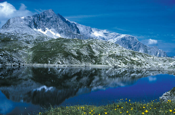 Bis in den späten Sommer säumen Blumenpolster und Enzian den blauen Butzensee am Fuße des Dolomitmassivs der Mohnenfluh. Die Bezeichnung „Butzen“ bezieht sich auf die vielen kleinen Quellen, die im und rings um den See entspringen.