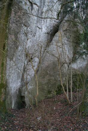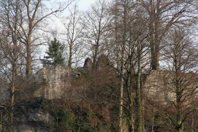 Nun stehen wir also am Fuße des Schlosshügels. Hier können Sie sich selbst überzeugen, wie ideal dieser Hügel zur Errichtung einer Festung war. Über die steil abfallenden Felsen war die Burg fast nicht zu erobern. Durch die zentrale Lage inmitten des Rheintales war die Burg eine natürliche Talsperre mit wichtiger strategischer Bedeutung. Burgen wurden aber immer auch als Demonstration der Macht und Größe weithin sichtbar auf eine Anhöhe gebaut. Erbaut wurde die Burg im 12. Jahrhundert durch die Welfen, erstmals urkundlich erwähnt wurde sie im Jahre 1152. Der Schlosshügel hatte aber wiederum zeitlich viel weiter zurückliegend große Bedeutung. In der Eiszeit, vor etwa 14000 bis 17000 Jahren reichte das Eis bis zum Gipfel der hohen Kugel, also rund 900 m über uns befand sich Eis. Nach der Eiszeit, vor etwa 12 000 Jahren reichte der Bodensee über das Gebiet des Kumma und des Schlosswaldes bis nach Chur. Der Schlosswaldhügel ragte aus dem Wasser. Daher haben auch auf diesem Hügel in der späten Jungstein- und frühen Bronzezeit Menschen gelebt. Knapp über dem Talboden am Nord- und Westfuße des Hügels, auch Horst genannt, wurden in der sogenannten Glitzbalme und in Höhlen Keramik aus der Frühbronzezeit und eine Kugelkopfnadel, ca 1,3 m tief im Torf gefunden. Auf dem Neuburghorst selbst fanden sich bei Grabungen in den Jahren 1950 und 1952 Spuren aus der frühen Bronzezeit, wie Pfostenlöcher und Balkenzüge. Die urgeschichtlichen Schichten waren aber durch die mittelalterliche Bautätigkeit über weite Bereiche stark gestört. Wenn sie nun nochmals Richtung Norden schauen, sehen sie den südlichen Ausläufer des Udelberges. Auf diesem Hügel befand sich einst der Adelssitz Udelberg, der ebenfalls im Besitz der Thumb von Neuburg war. Dieser bildete einen geschlossenen Gutskomplex und war vom Verkauf der Neuburg an die Habsburger 1363 nicht betroffen. 1756 wurde der Ansitz Udelberg bis auf den unterirdischen Weinkeller abgerissen. Dieser – im Volksmund als „Teufelskeller“ bekannt- fiel 1971 dem Autobahnbau zum Opfer.