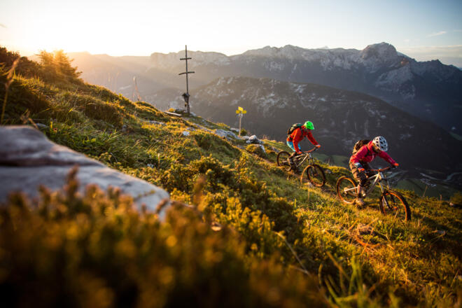1200 Höhenmeter in nur 27 Kilometer. Gleich zu Beginn geht es über den Hölzlkaser und weiter Richtung Wetterkreuz ständig bergauf. Nach eine längere Tragestrecke zur Perchthöhe geht es bergab zur Hochalm und ins Heutal. Nach einer kurzen Steigung zur Moarlack führt die Tour über die Gföllerstraße und die Heutal Landesstraße zurück nach Unken zu unserem Ausgangspunkt.