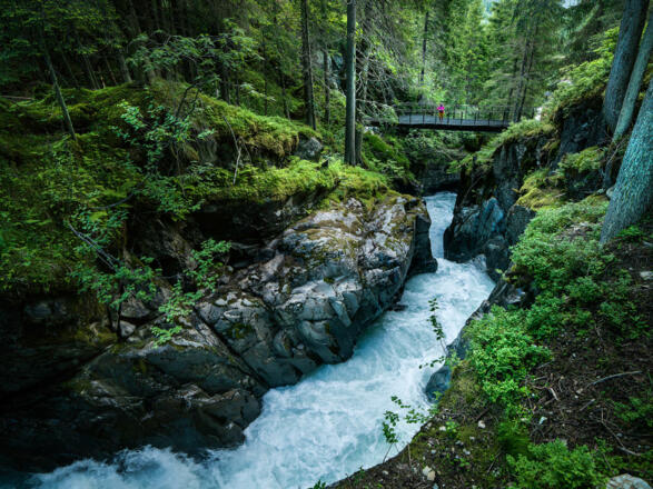 Folgt man dem WildeWasserWeg, ausgehend von der Wilde Wasser Arena taleinwärts, so könnten die Gegensätze nicht größer sein. Wandert man zunächst noch am Ufer des gemächlich fließenden Ruetzbaches, ist man im nächsten Moment umgeben von tosenden Wassermassen. Zwei, teils über dem Abgrund hängende Plattformen als auch ein Holzsteg vermitteln eindrucksvoll die unbändige Kraft des Baches. Dank dieser Naturgewalt ist die spektakuläre Schlucht mit kleinen Wasserfällen und Stromschnellen entstanden. Am Ausgang des Katarakts, wie eine durch Blöcke und Felsriegel gegliederte Stromschnelle bezeichnet wird, gelangt man zur urigen Tschangelair Alm. Hier bietet sich die Gelegenheit, noch eine kurze Rast einzulegen, bevor es zum Endpunkt der ersten Etappe geht. Die Umgebung ist durch eine dichte Aufeinanderfolge von Lawinengängen und Murbrüchen geformt und weist die speziell dafür angepasste Vegetation auf: Beerensträucher und talwärts gedrückte Birken, dazwischen oft schmale Fichtenstreifen.