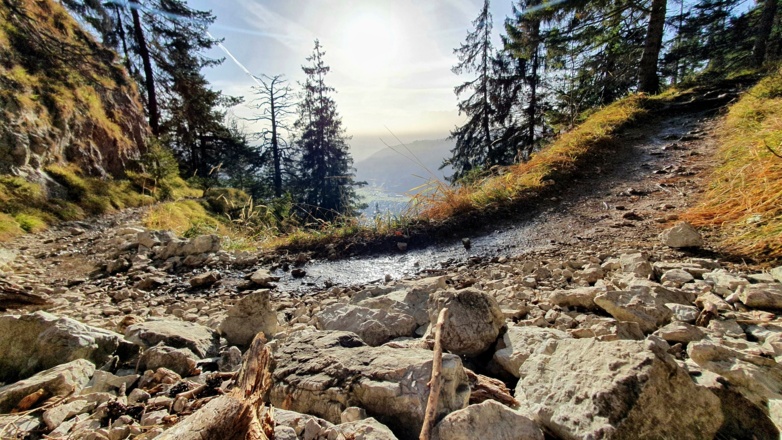 Ab hier geht es auf einem schönen Naturpfad weiter, gespickt mit Stufen, Wurzeln, Schotter, Bergauf- und Flachpassagen. Sobald du die kommenden 850 Meter und 100 Höhenmeter auf dem Steig hinter dir gelassen hast, halte dich links in Richtung „St. Martinshütte“, hier kannst du etwas verschnaufen, denn du hast bis zum Forstweg ein entspanntes Stück vor dir.