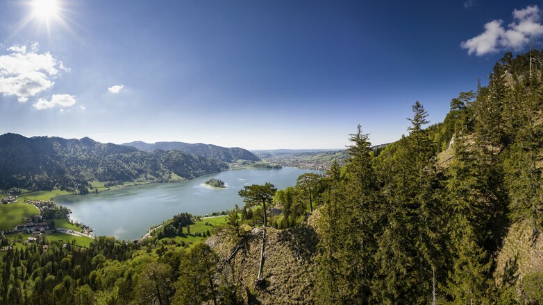 Die Tour startet in Schliersee am Parkplatz Unterleiten. Wir folgen dem Weg 674. Er führt bald nach rechts ab, am letzten Haus von Unterleiten links vorbei und mit einer Kehre hinauf zu einem geteerten Sträßchen. Wir wandern zum Bauernhof Oberleiten. Unterhalb dieses Hofes zweigt der 674 nach rechts ab, führt zwischen zwei Zäunen hindurch auf aussichtsreiche Weiden. Wir überqueren sie und wandern in den Wald hinein. Dort wird der Weg etwas breiter und auf breiten Serpentinen folgen wir dem Weg bergauf. Wir bleiben auf dem Weg 674 und wandern mit leichtem Auf und Ab weiter, bis wir die Abzweigung zur Ruine Hohenwaldeck erreicht haben. In nur wenigen Schritten haben wir die Ruine erreicht. Geheimnisvoll und wild romantisch steht sie auf einem Felsvorsprung hoch über dem Schliersee. Nur wenige Steinmauern haben den Jahrhunderten getrotzt. Wir lesen die geheimnisvolle Geschichte der Ruine auf einer Texttafel nach. Danach zieht es uns hinaus zum Aussichtspunkt mit seinen zwei Bänken. Hier freuen wir uns über den fantastischen Blick auf den Schliersee, die Ortsteile und bis weit hinaus ins Alpenvorland. Zurück gehen wir bis zur Wegabzweigung. Dort biegen wir rechts ab und wandern im Bergwald abwärts. Zuletzt erreichen wir wieder die B307 in Fischhausen. Von dort geht es am Westufer des Schliersees zurück zum Ausgangspunkt der Tour. Alternativ besteht hier auch die Möglichkeit, kürzer am Ostufer zurückzuwandern oder auch das Schiff zurück nach Schliersee zu nehmen.