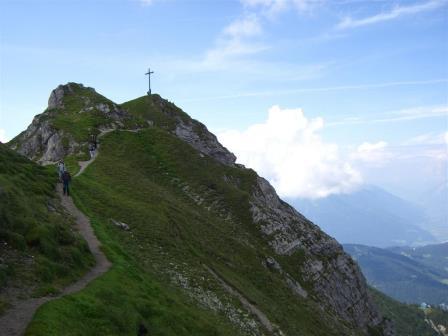 Hier geht man links, steigt bald eine Leiter hinauf. Im Wechsel von Geh- und leichtem Klettergelände (meist Stahlseile) geht es auf ein Felsentor zu. Hier geht man rechts und erreicht wieder im Wechsel von reinen Gehpassagen und leichten Kraxeleinlagen das Gipfelkreuz der Reitherspitze.